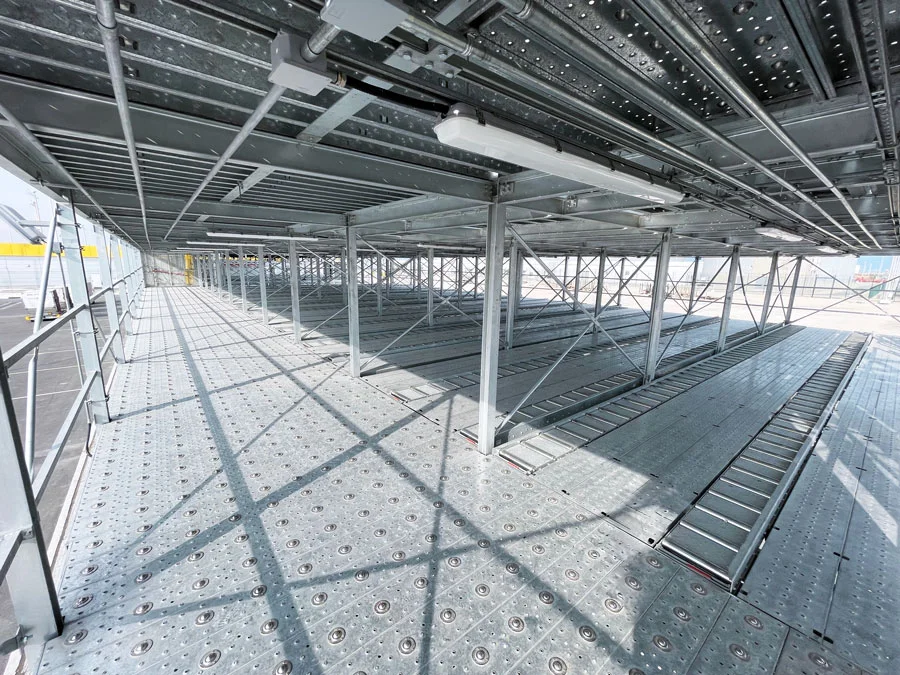 The Empty ULD Storage Hoist connects different levels of manual storage racks for ULDs, providing safe and space-efficient vertical transfer. Installed in a steel or concrete shaft, it uses an electrically driven cable hoisting system with smooth acceleration and deceleration. A non-powered roller deck at 508 mm system height enables easy manual transfer of ULDs, supported by flared side guides for precise alignment. Optional safety doors at each access level further enhance secure operation
